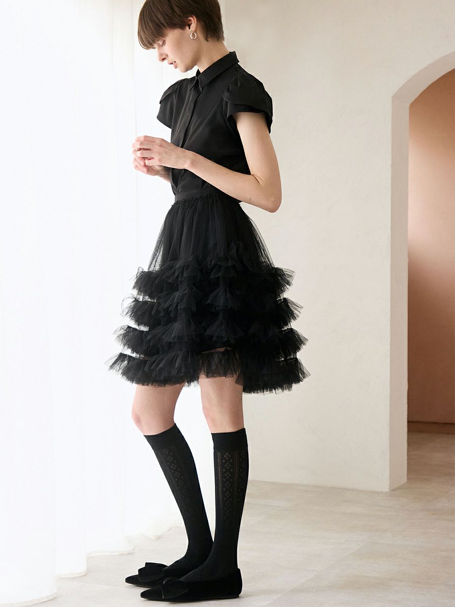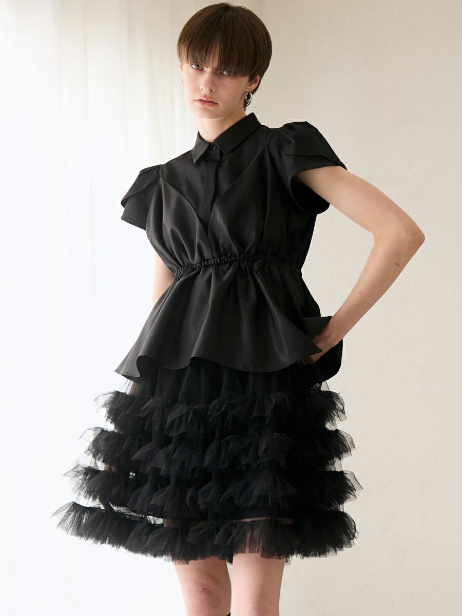 袖のチューリップシルエットにこだわり、身頃のデザインは極力シンプルに仕上げたブラウス。