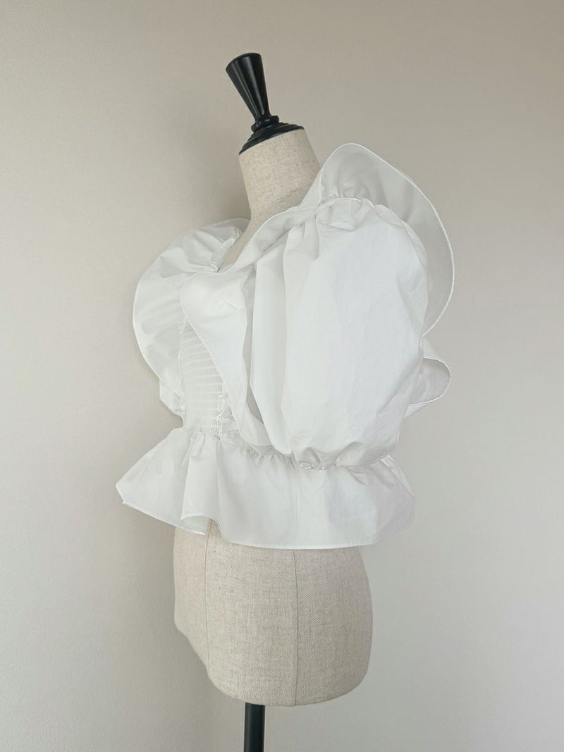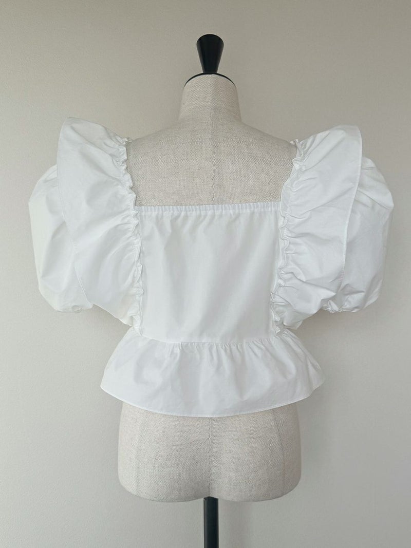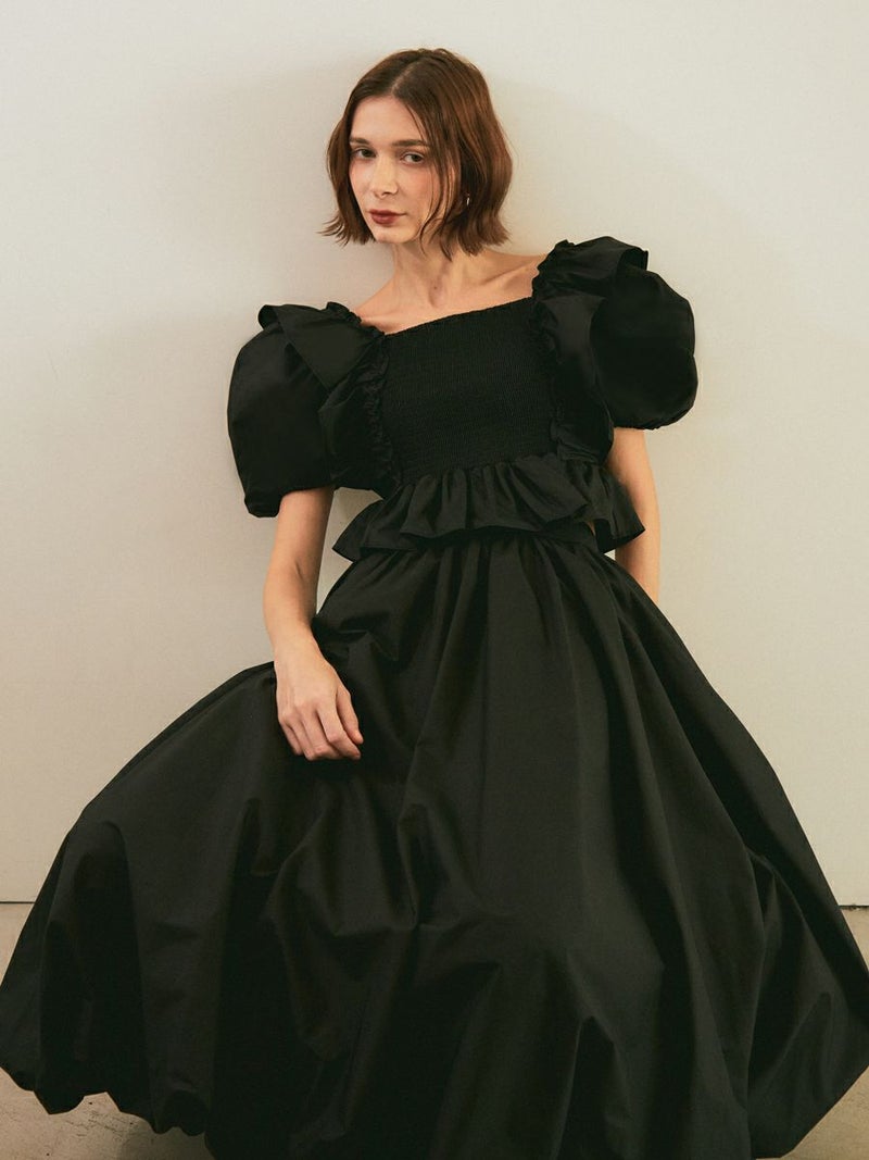お袖にたっぷりとボリュームを出し、デコルテや背中を美しく見せてくれるスクエアネックで抜け感のある印象に仕上がりました。