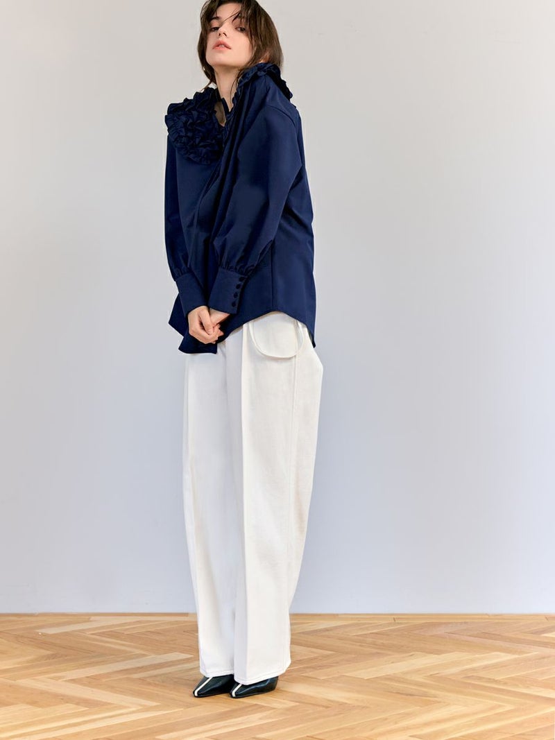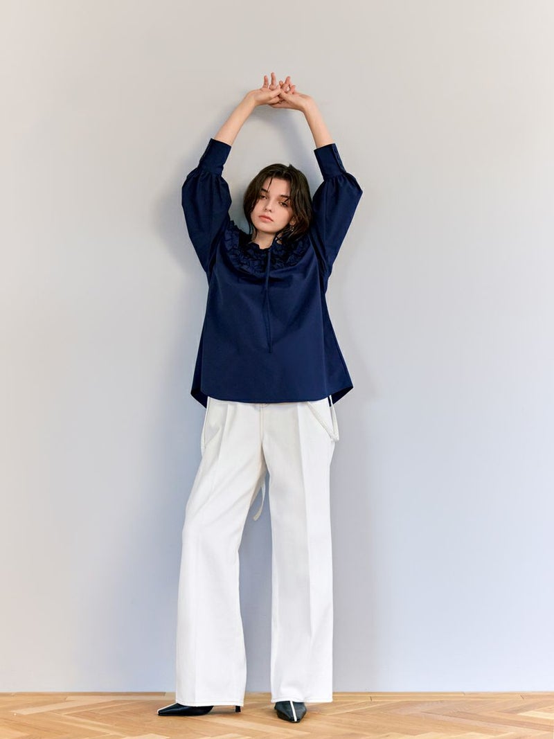 フロントのセンターラインをウエスト切り替え位置までいれることで、すっきりと足を長く見せてくれます。