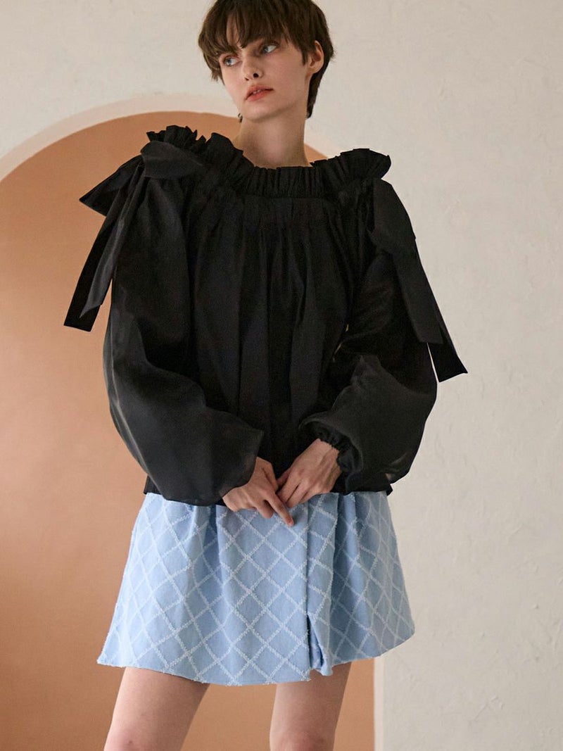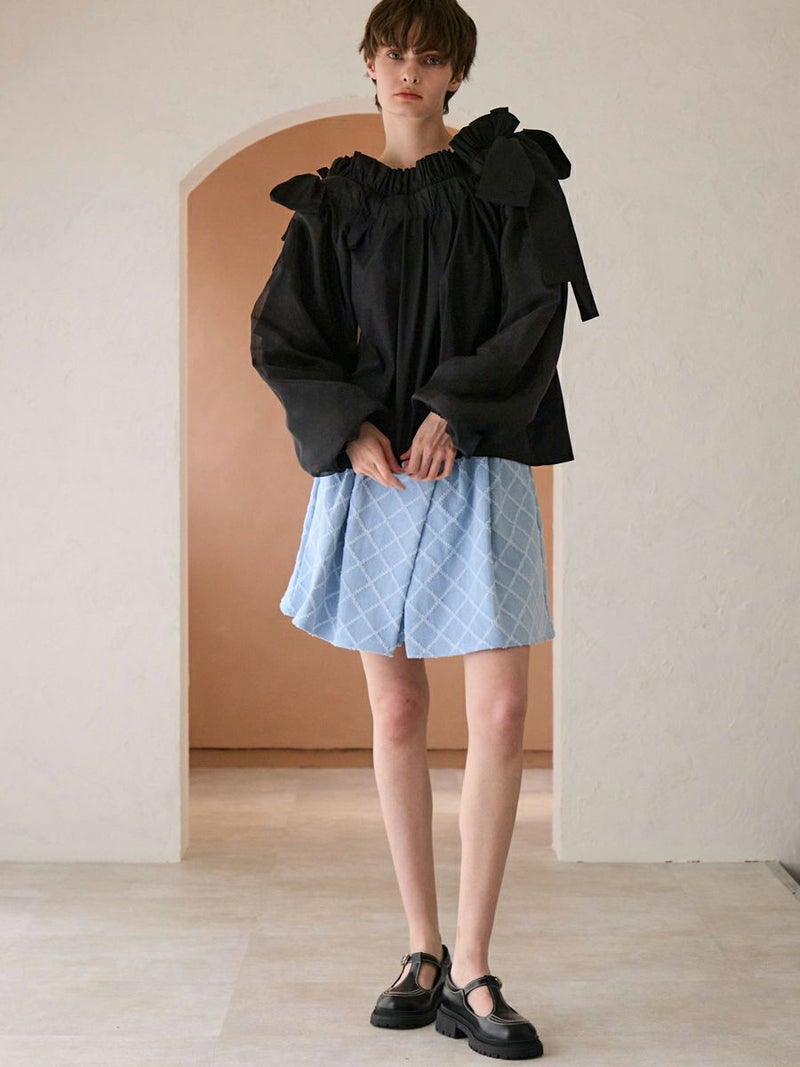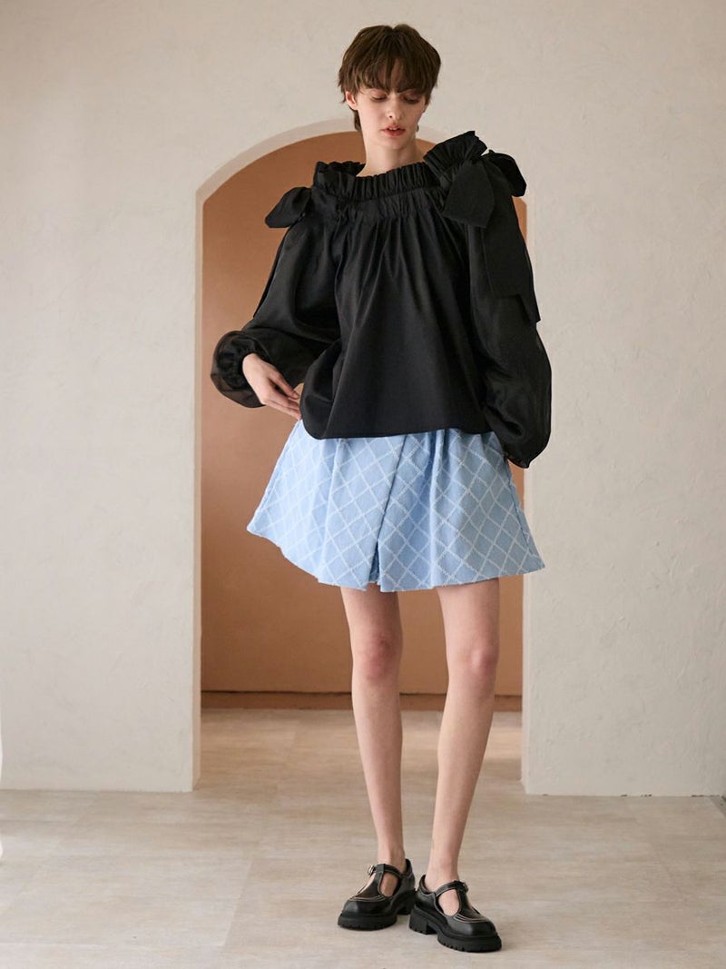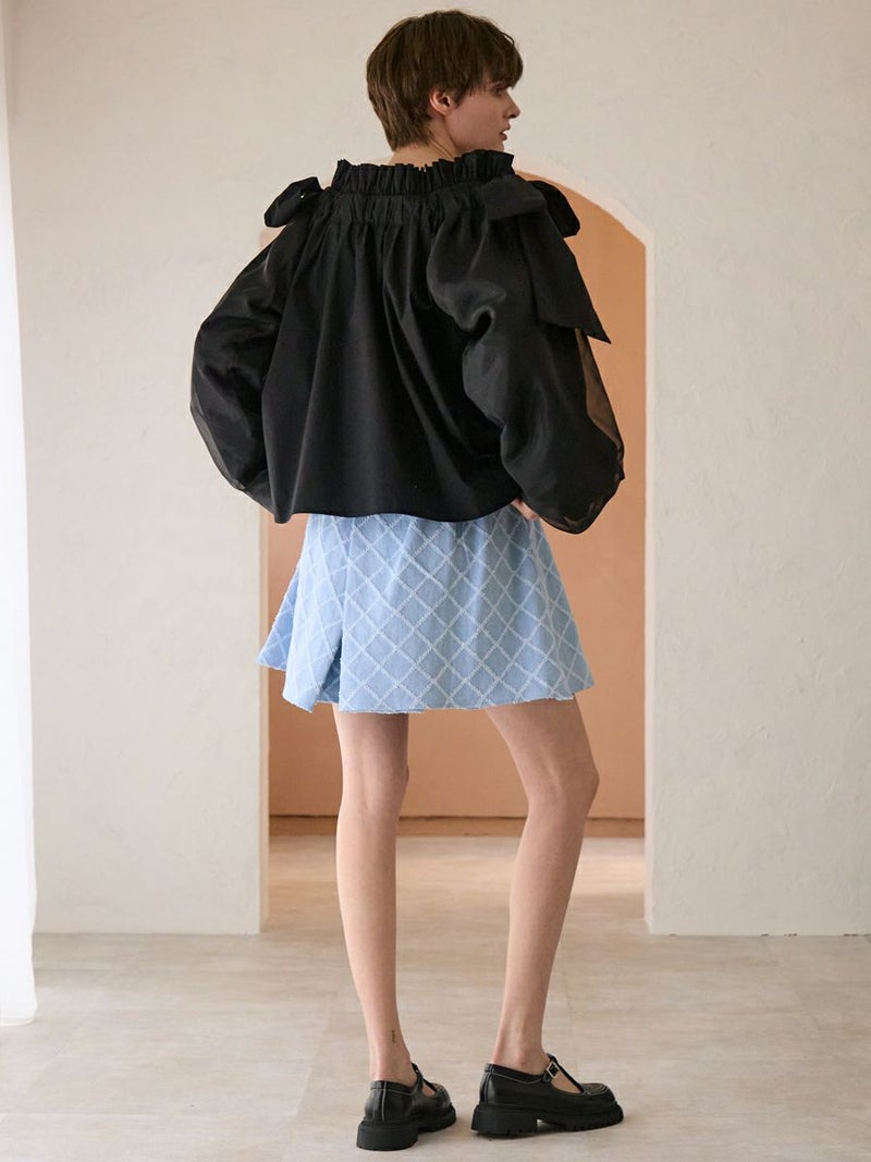 何層にも重なったタックがクレープのようなデニムショートパンツ。