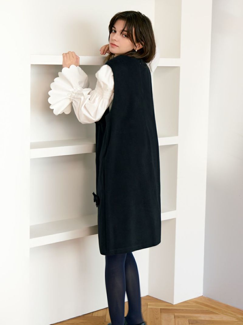 スリーブレスのためブラウスやニットなどインナー合わせが楽しめるのも魅力。