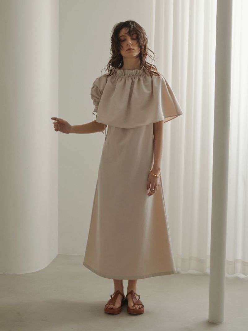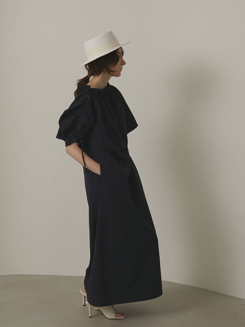 2way でご着用いただけるAラインシルエットのアシンメトリーギャザーワンピース。