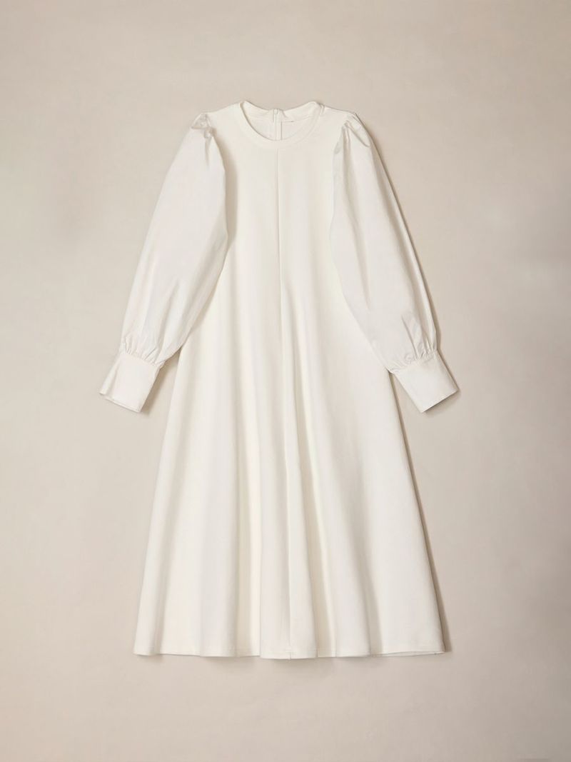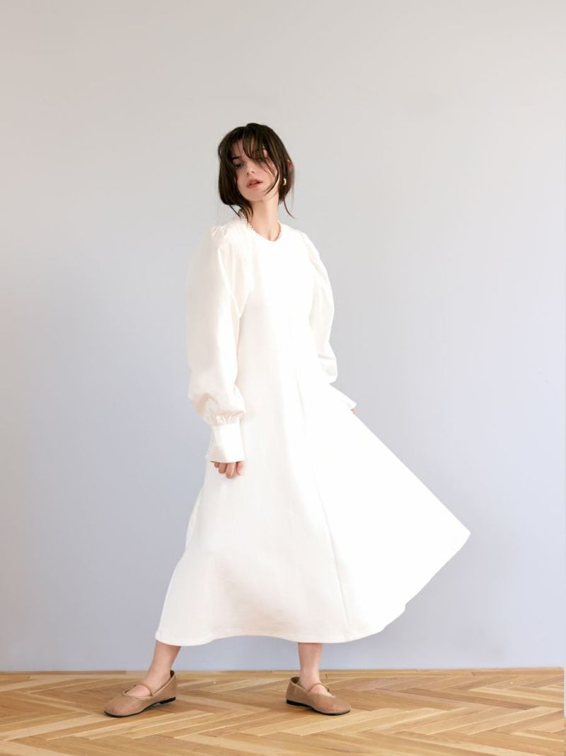 フィット&フレアのシルエットとパフスリーブが女性らしさとスタイルアップ効果を演出します。