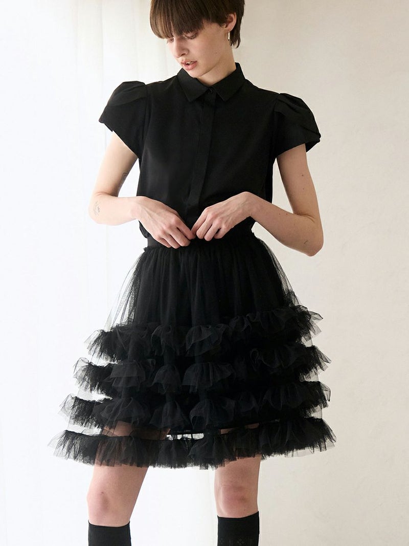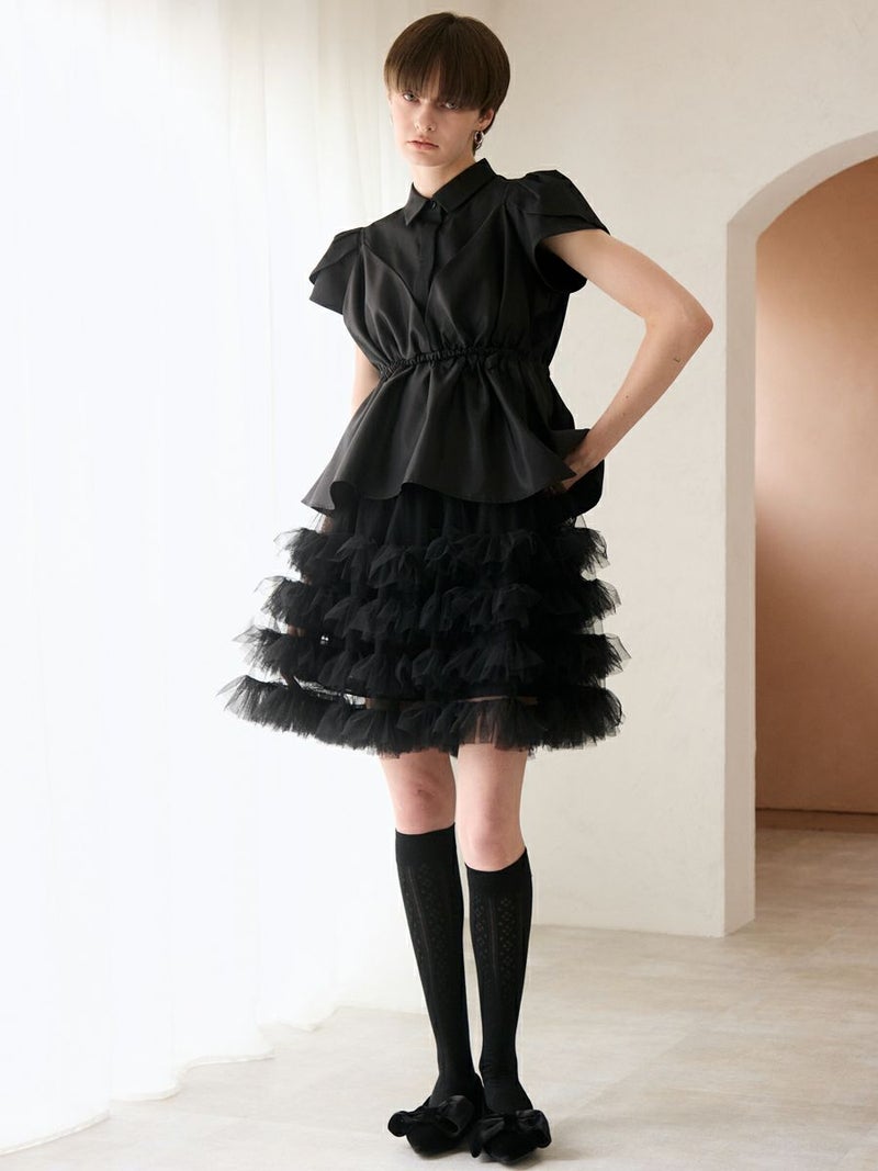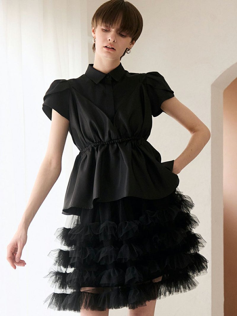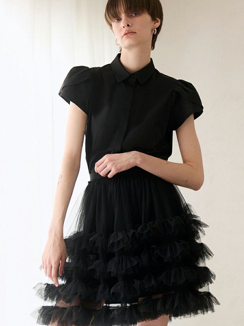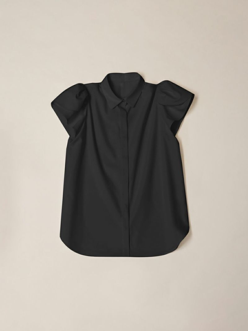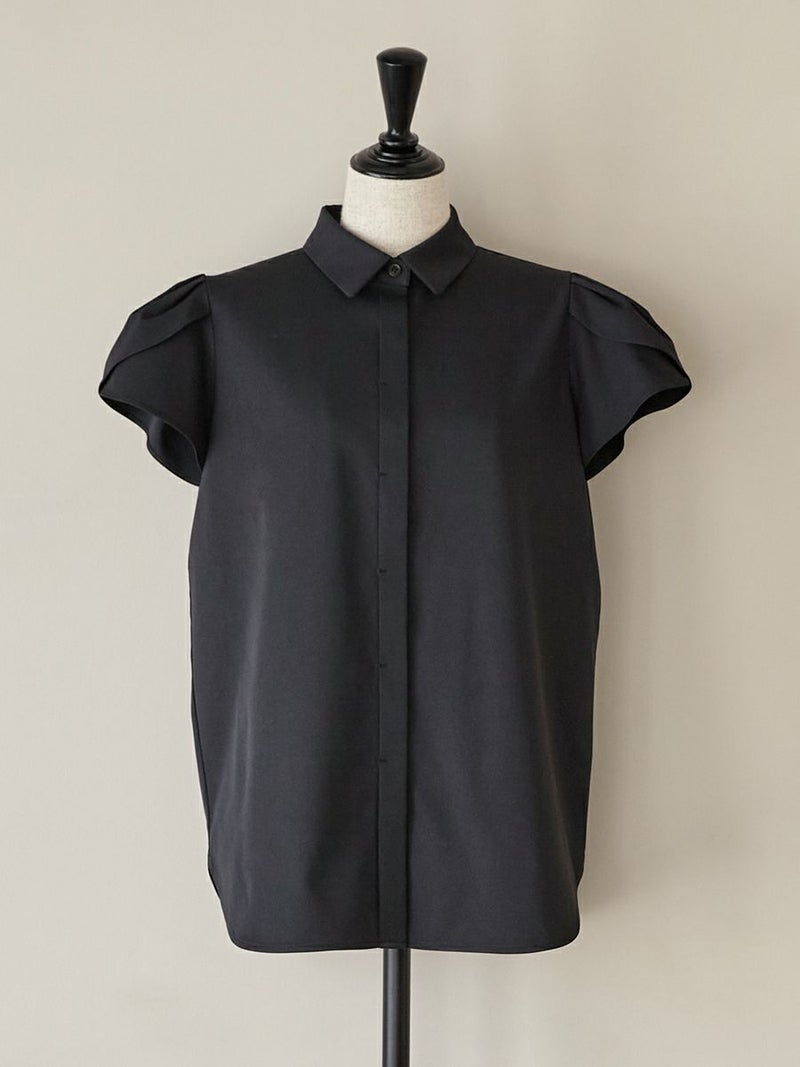 袖のチューリップシルエットにこだわり、身頃のデザインは極力シンプルに仕上げたブラウス。