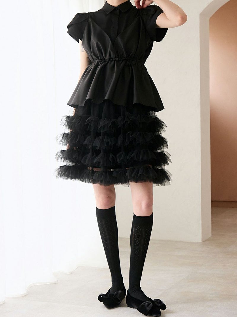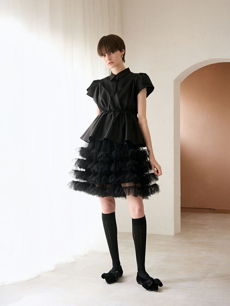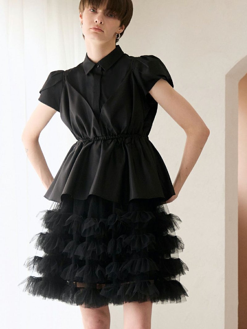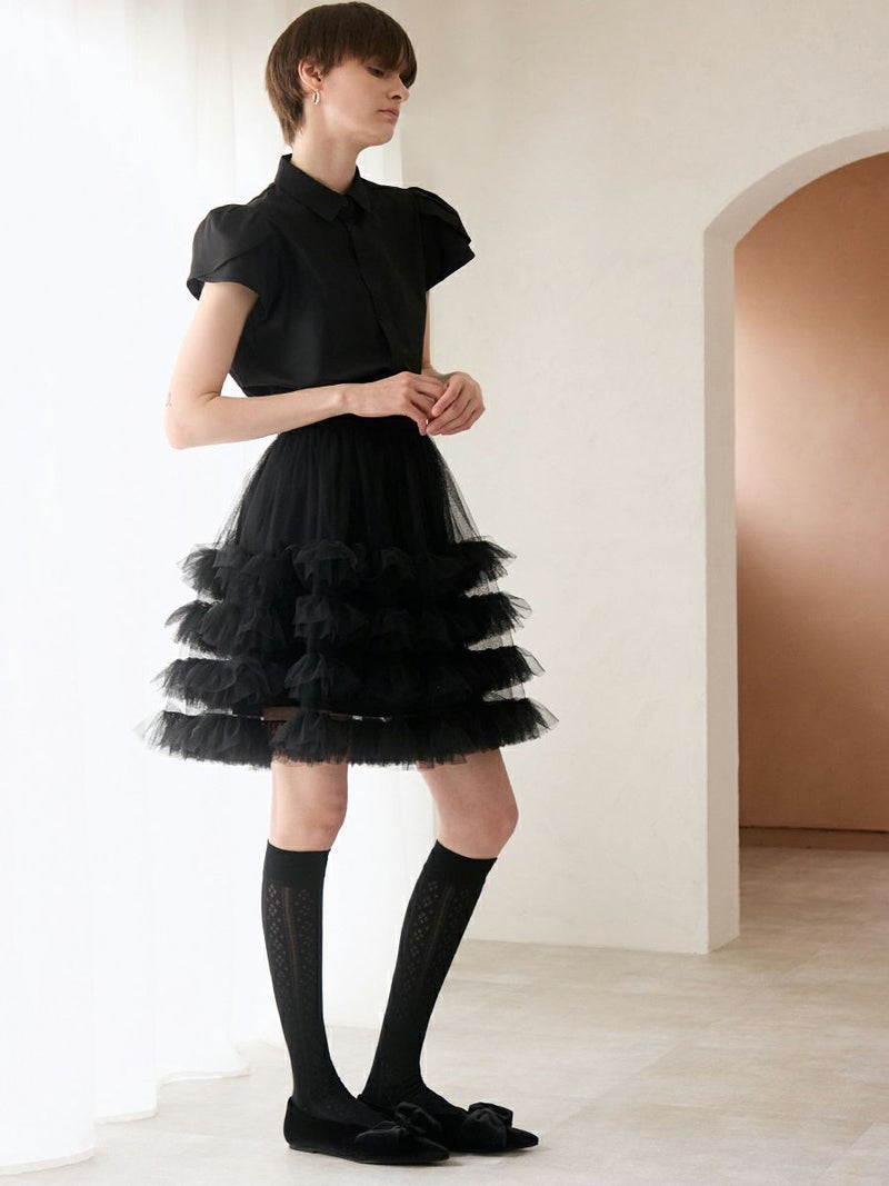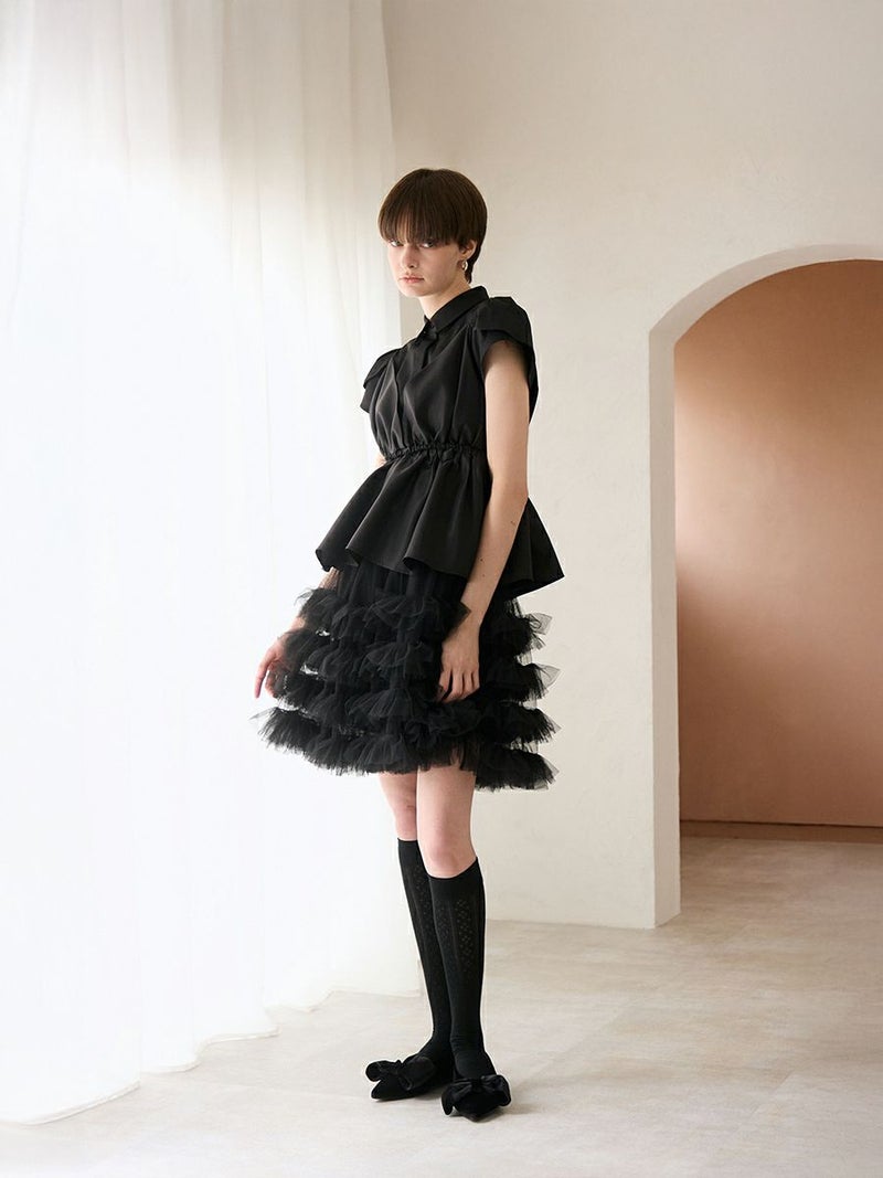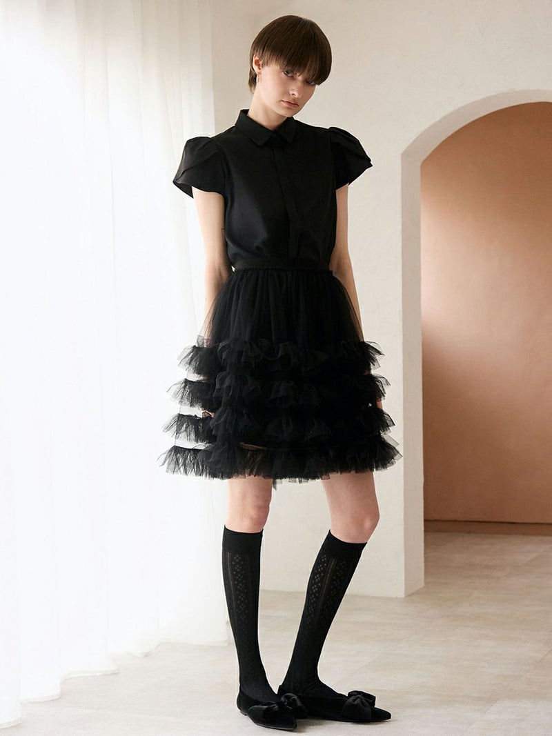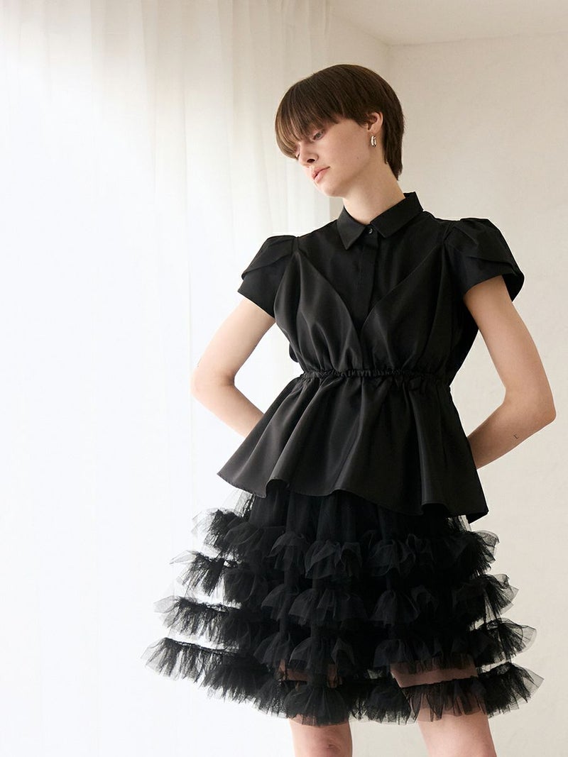 袖のチューリップシルエットにこだわり、身頃のデザインは極力シンプルに仕上げたブラウス。