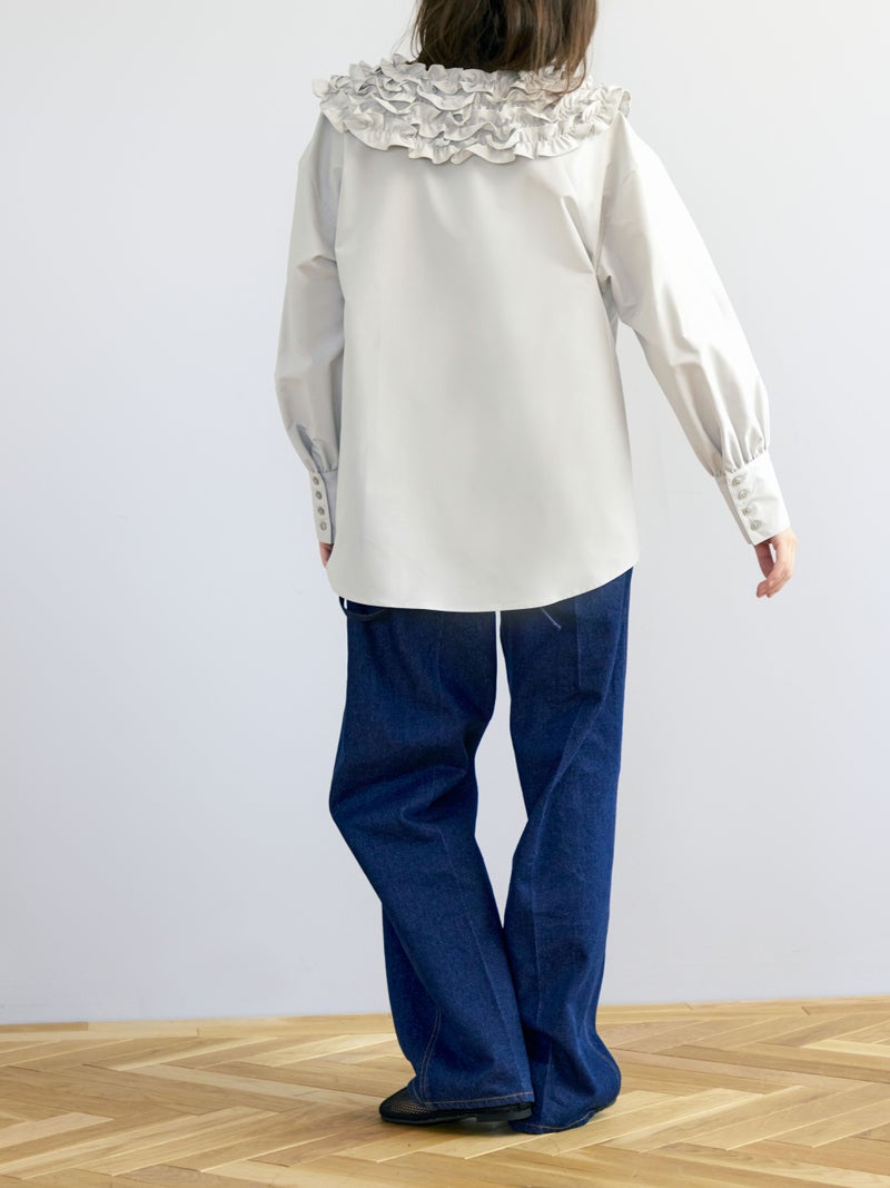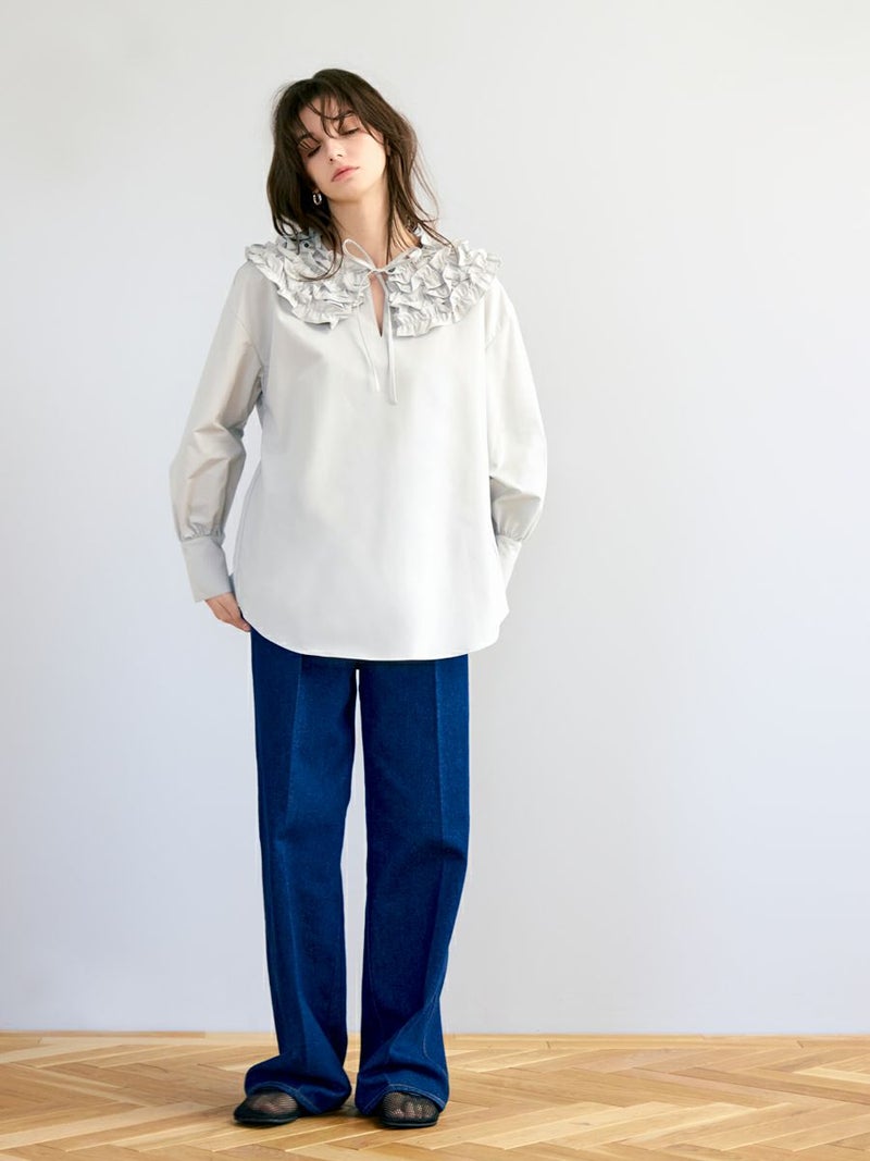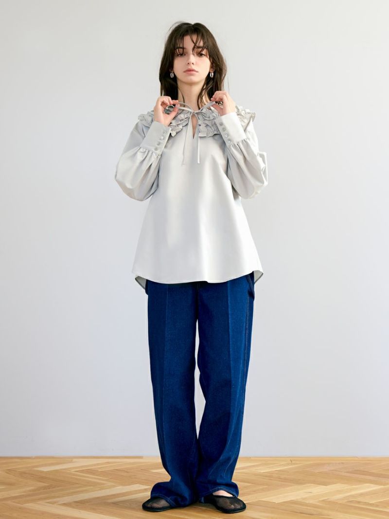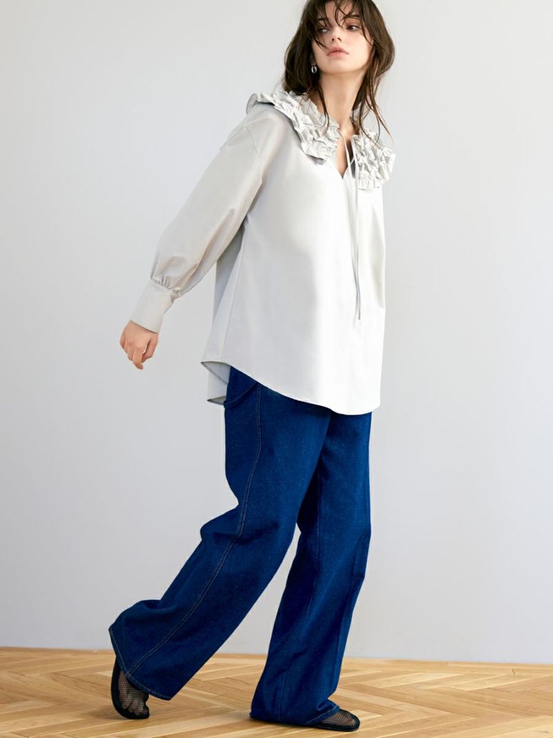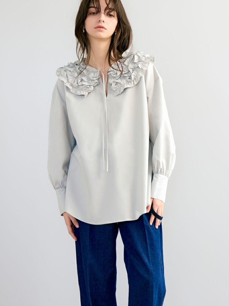 何層にも重なったふわふわのフリルが魅力的な、フランスのお菓子を連想させたミルフィーユカラーブラウス。