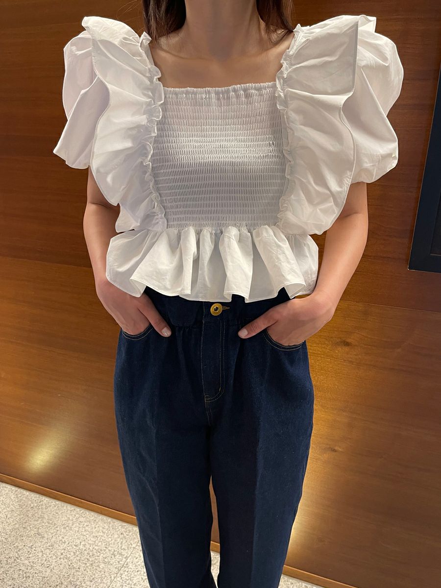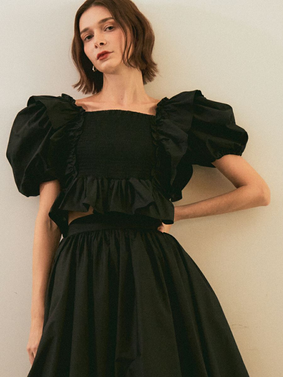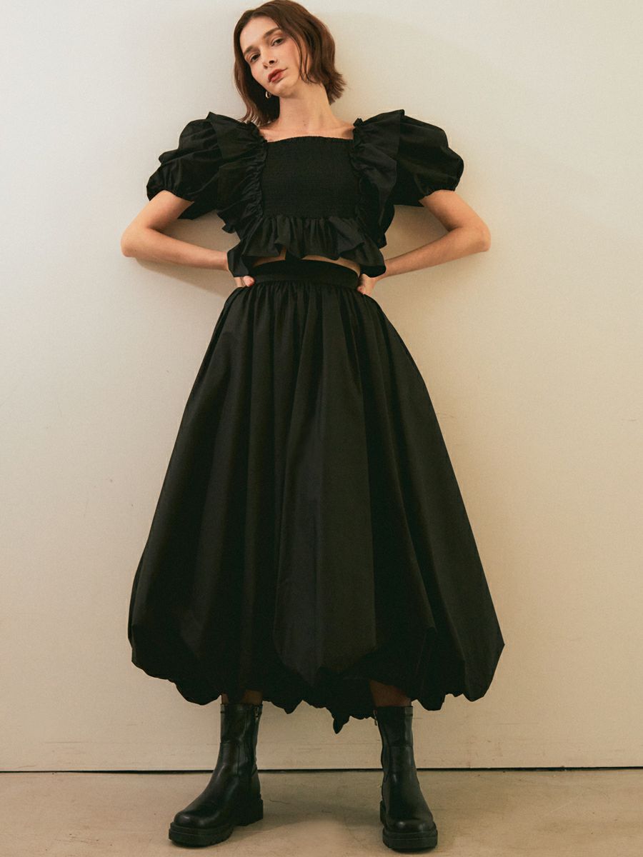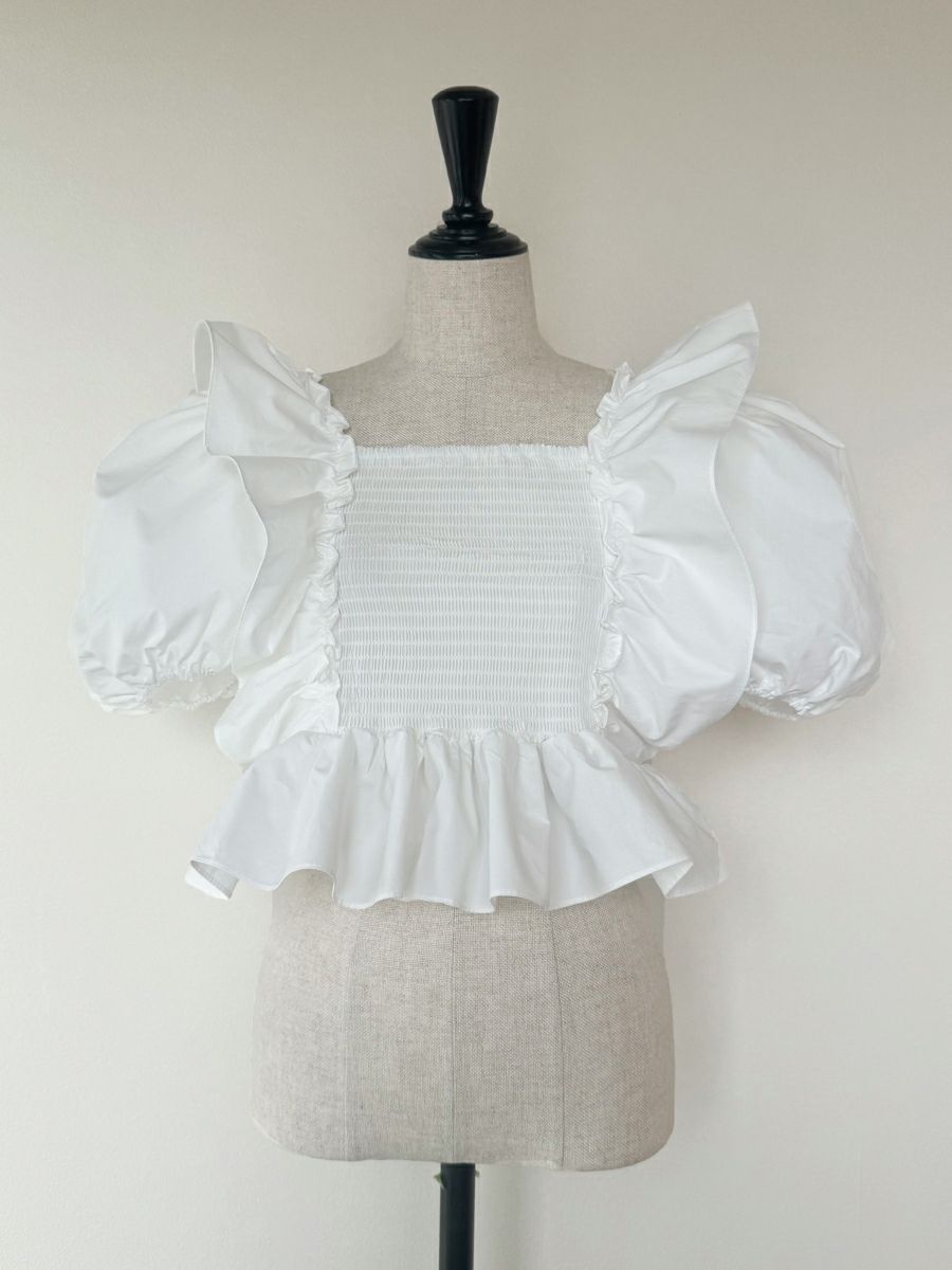 お袖にたっぷりとボリュームを出し、デコルテや背中を美しく見せてくれるスクエアネックで抜け感のある印象に仕上がりました。