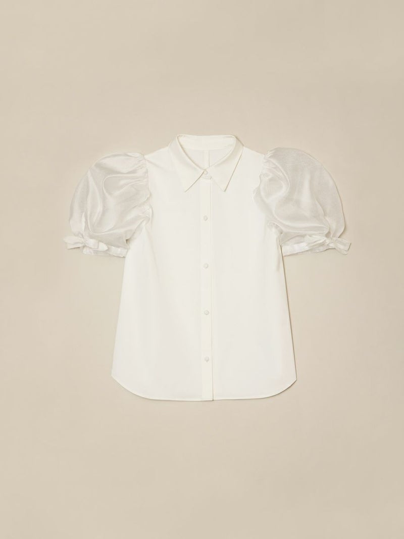 アメ細工のような立体的なお袖がポイントなシアーギャザーブラウス。