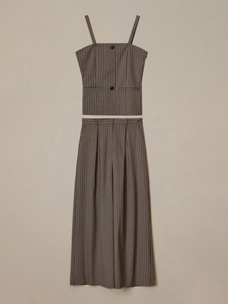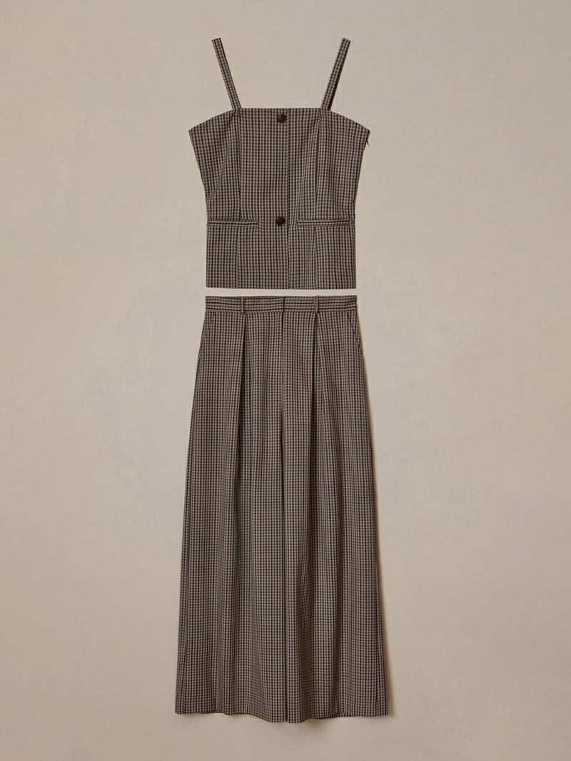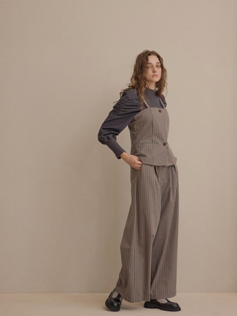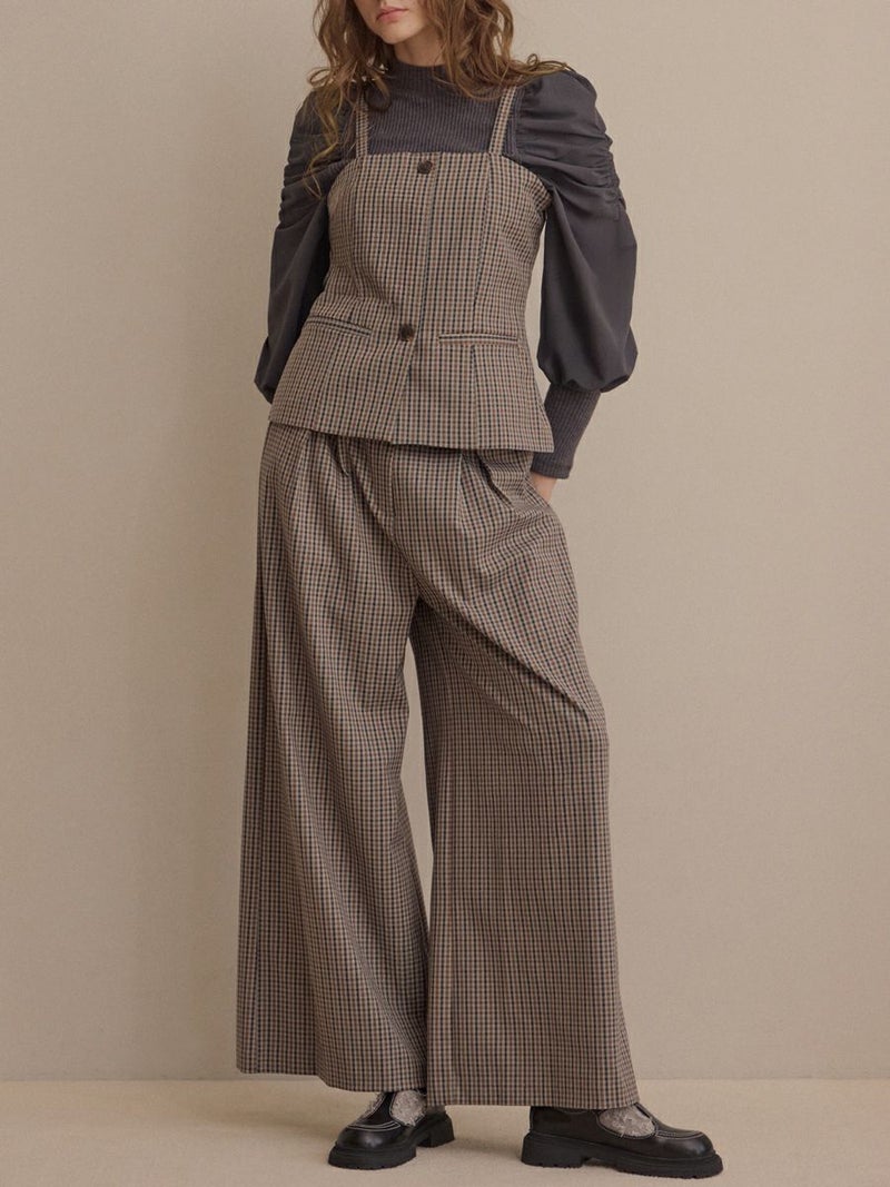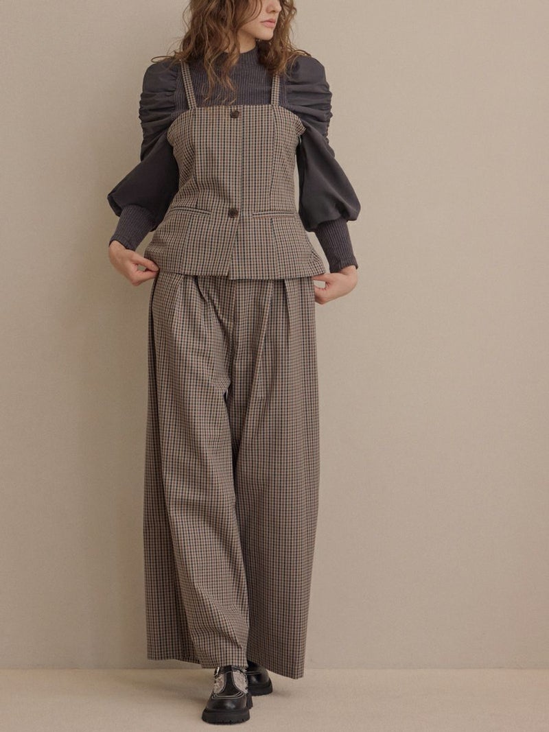 クラシカルなミニグレンチェック柄が印象的なビスチェとパンツのセットアップ。