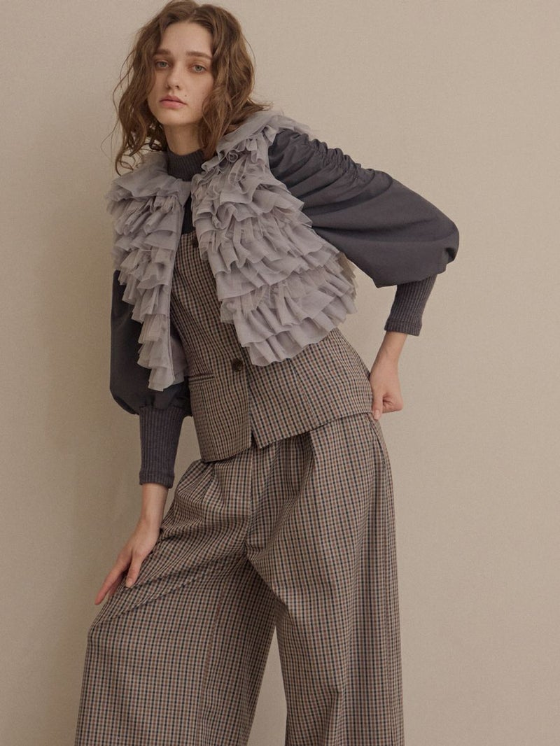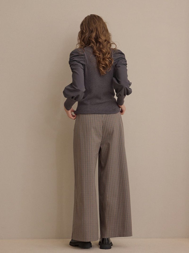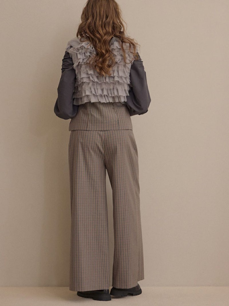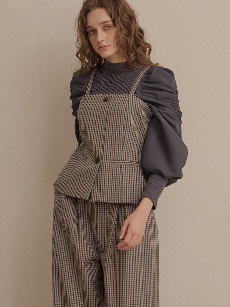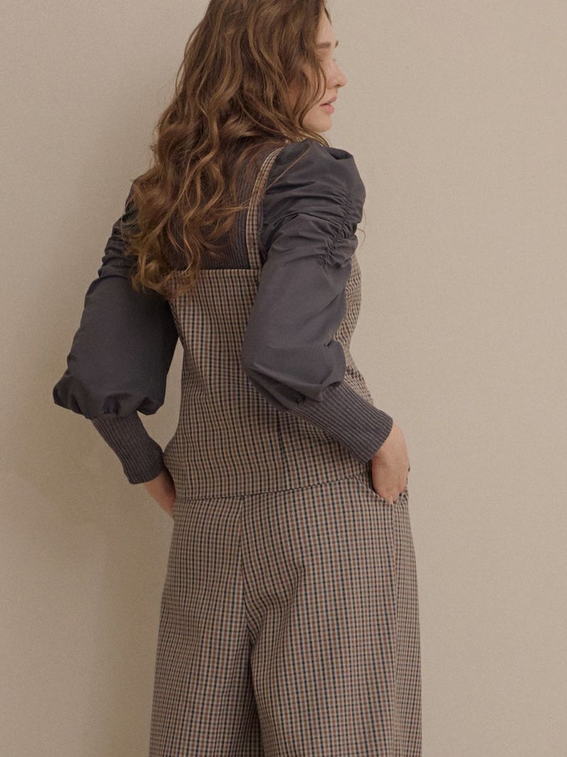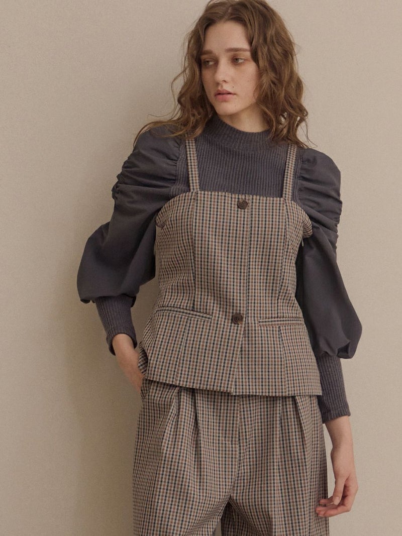 クラシカルなミニグレンチェック柄が印象的なビスチェとパンツのセットアップ。