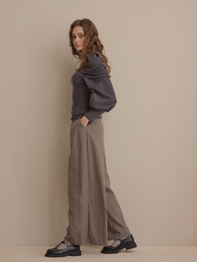 パンツはゆとりのあるワイドシルエットで、動くたびに美しく落ちる生地感が魅力。
