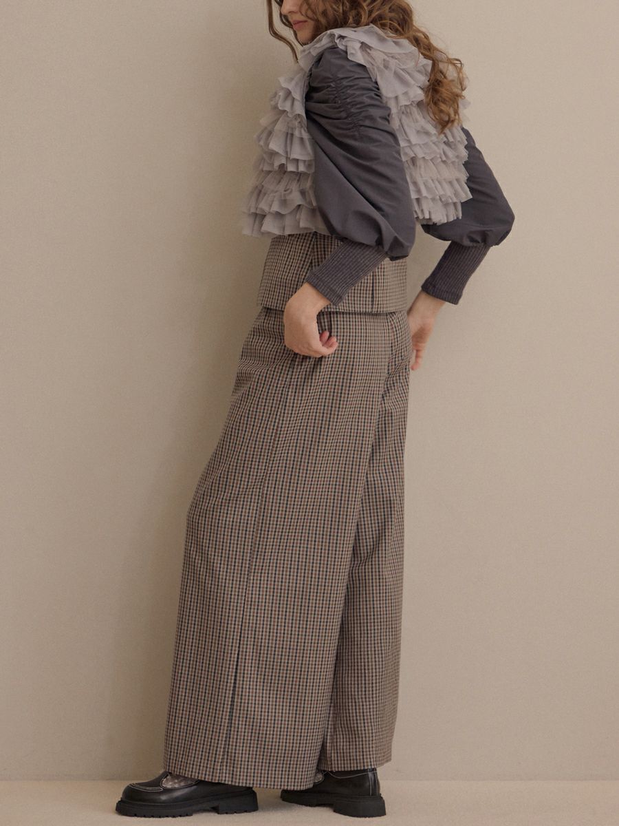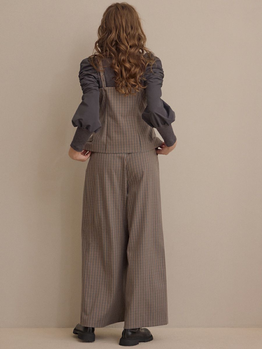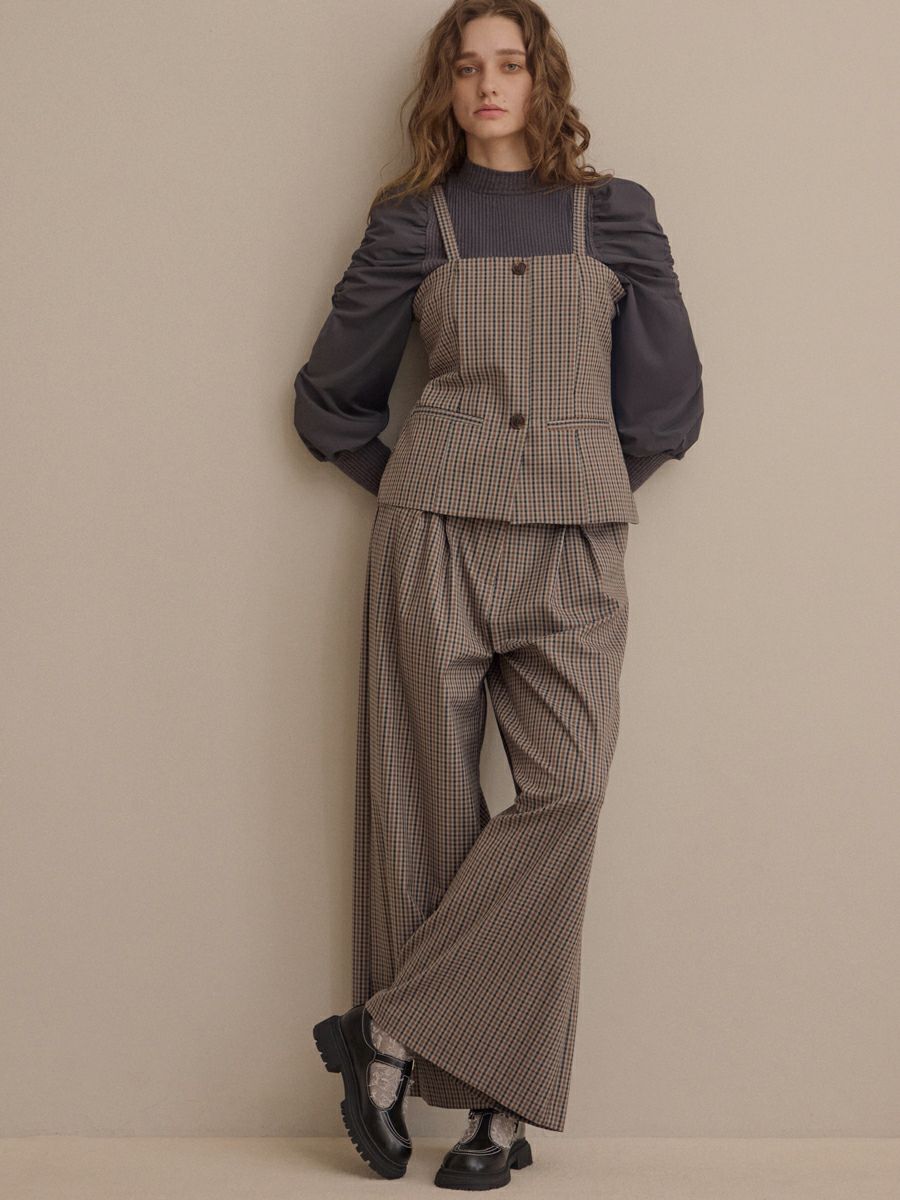 クラシカルなミニグレンチェック柄が印象的なビスチェとパンツのセットアップ。