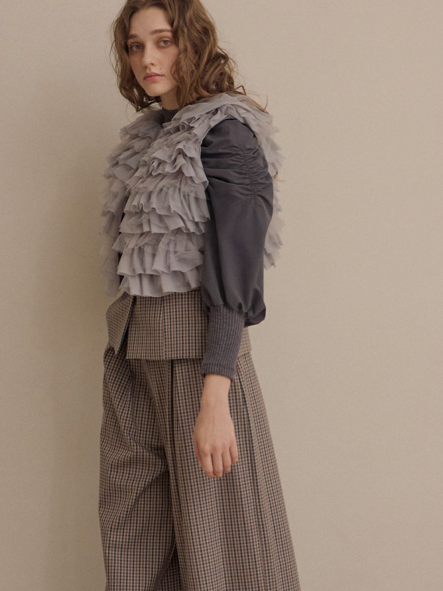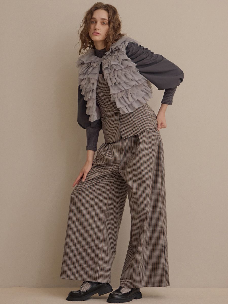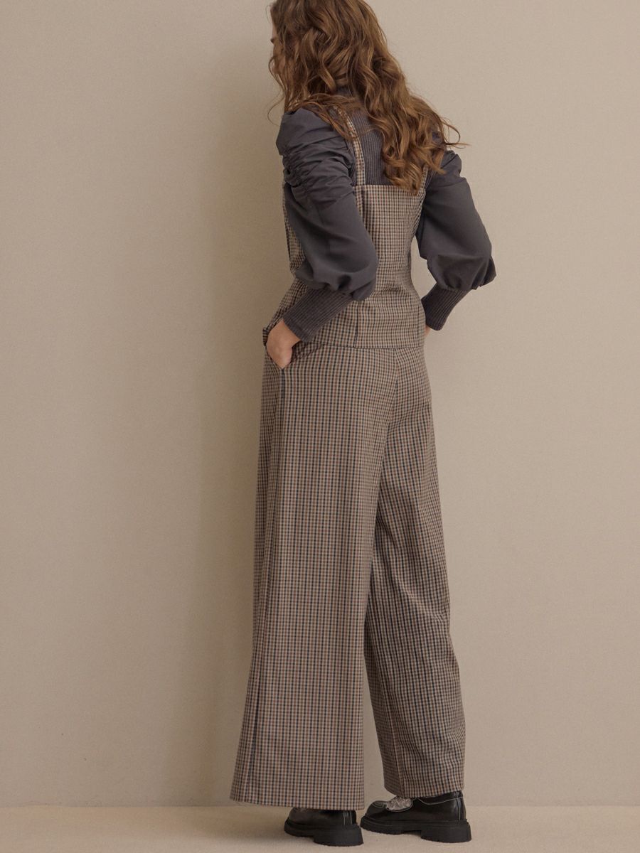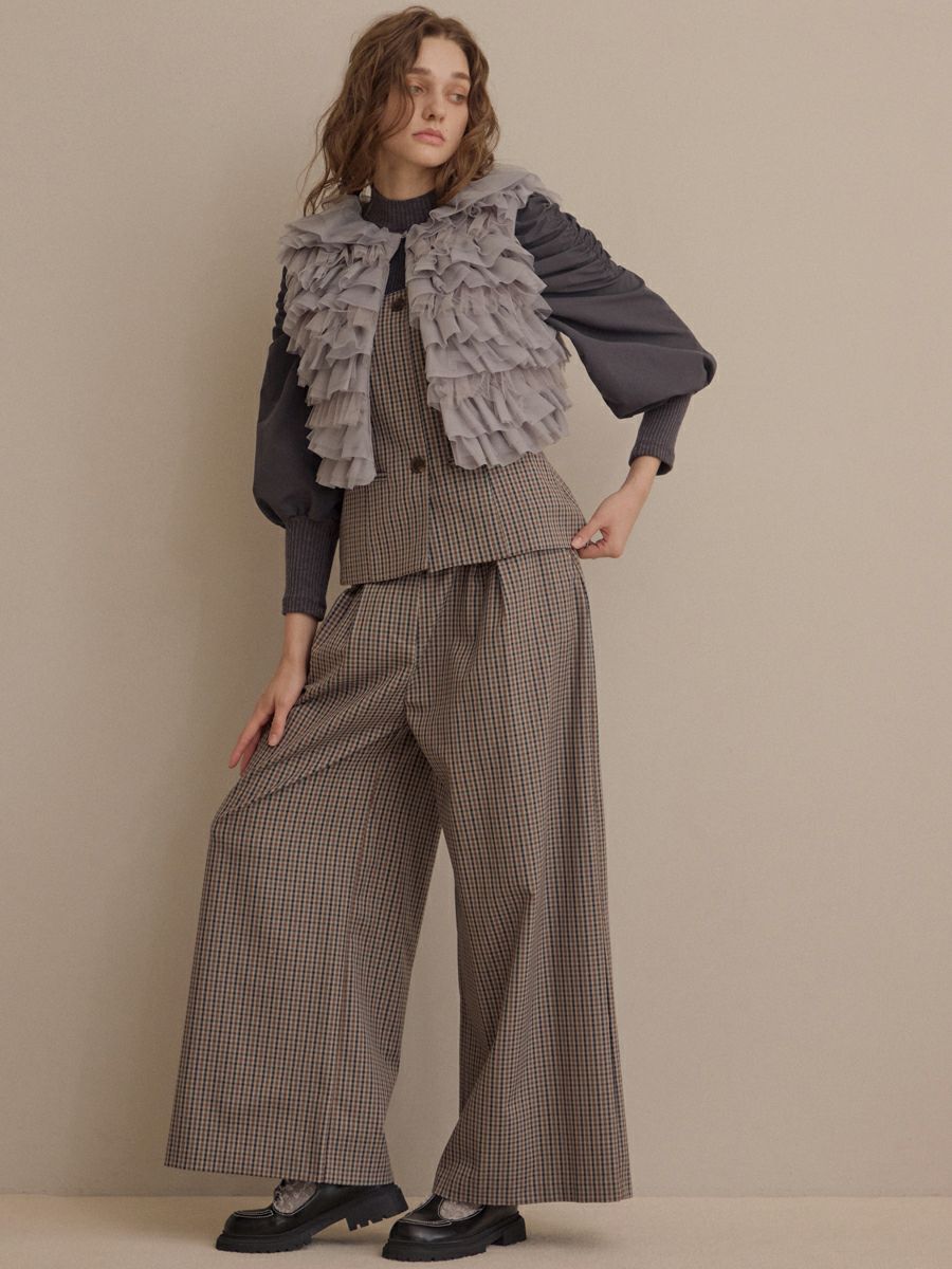 クラシカルなミニグレンチェック柄が印象的なビスチェとパンツのセットアップ。