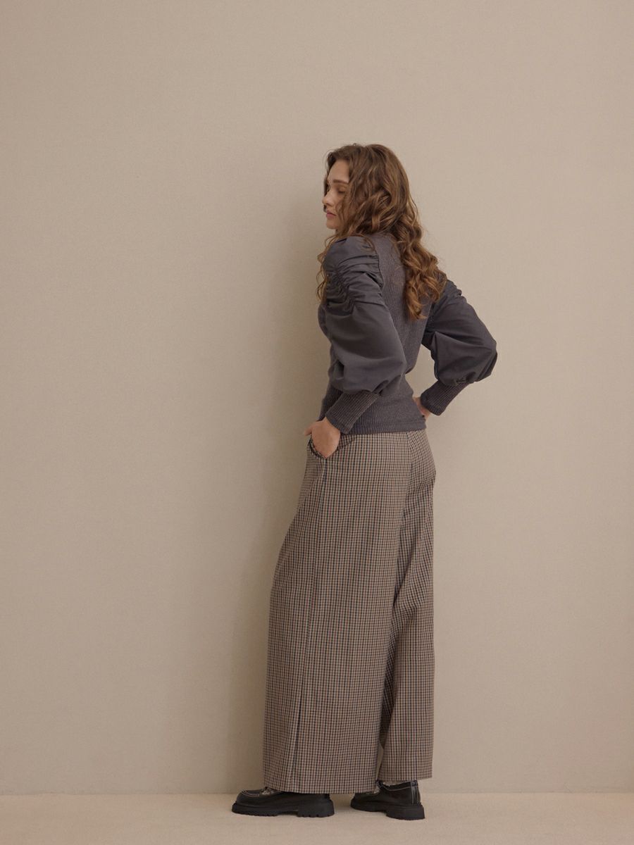 パンツはゆとりのあるワイドシルエットで、動くたびに美しく落ちる生地感が魅力。